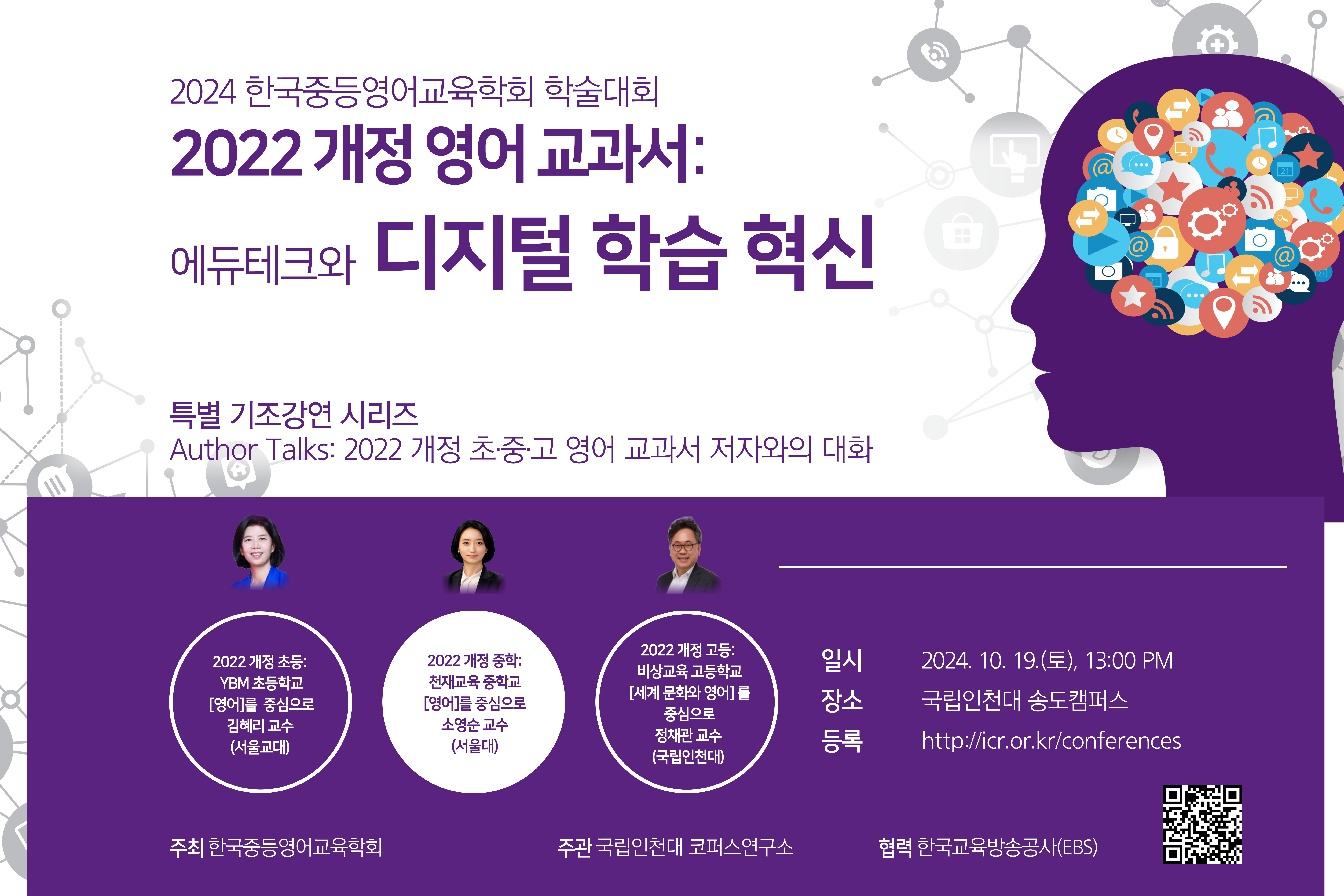 오는 10월 19일(토) 오후 1시부터 국립인천대학교 송도캠퍼스에서 '2022 개정 영어 교과서: 에듀테크와 디지털 학습 혁신'을 주제로 2024 한국중등영어교육학회 연례 학술대회를 개최합니다.