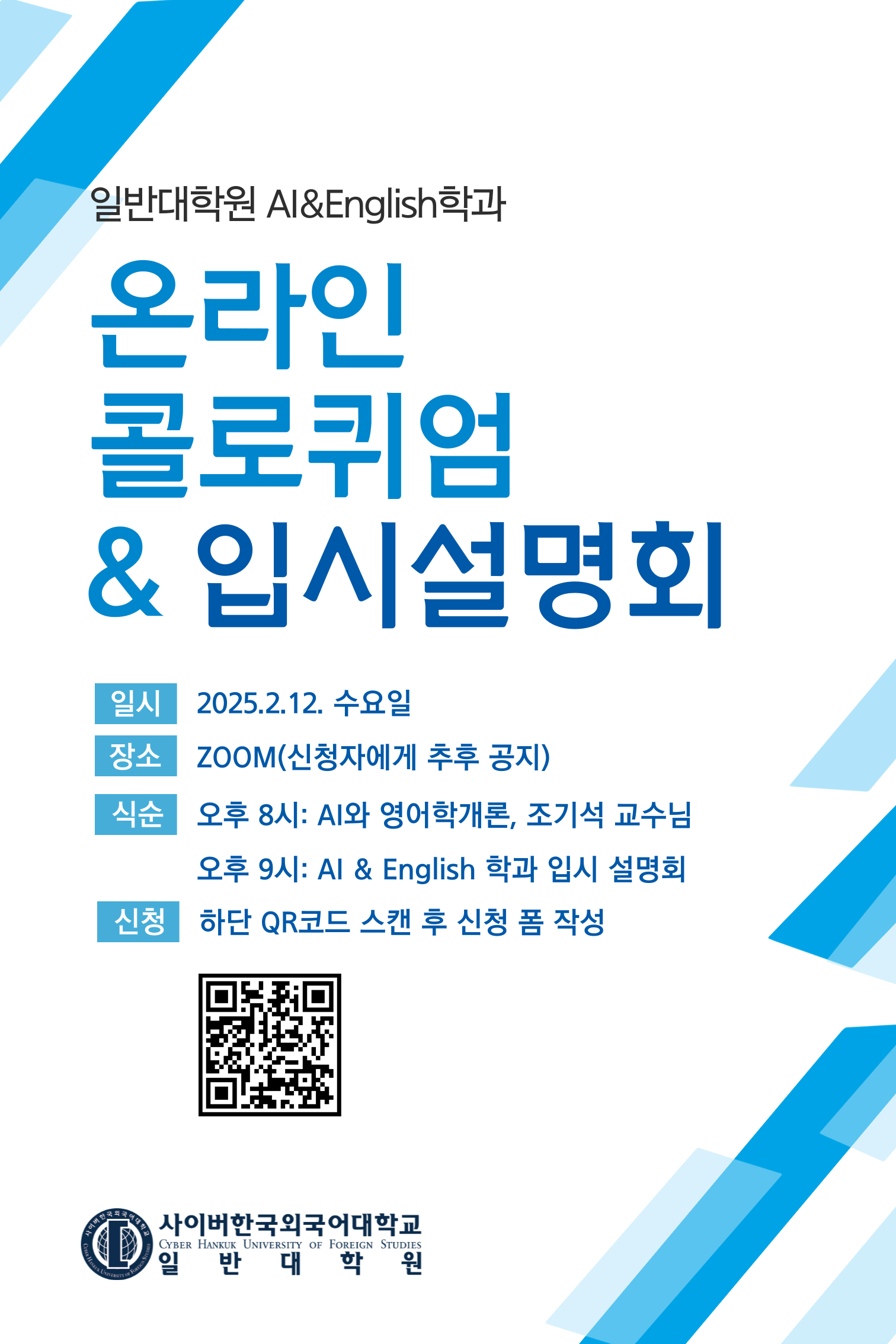 2월 12일(수) 오후 8시 - 일반대학원 AI&English학과 콜로퀴엄 및 입학설명회(온라인)