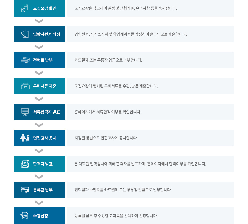 • 합격자 발표:본 대학원 입학심사에 의해 합격자를 발표하며, 홈페이지에서 합격여부를 확인합니다.